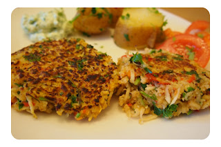 Also eigentlich muss man nur alles vermischen, Laibchen formen und in wenig Fett herausbraten. Ich hab Petersilerdäpfel und einen Joghurt-Dip (Joghurt, Salz, Pfeffer, Kräuter) dazu gemacht. Und natürlich Salat.