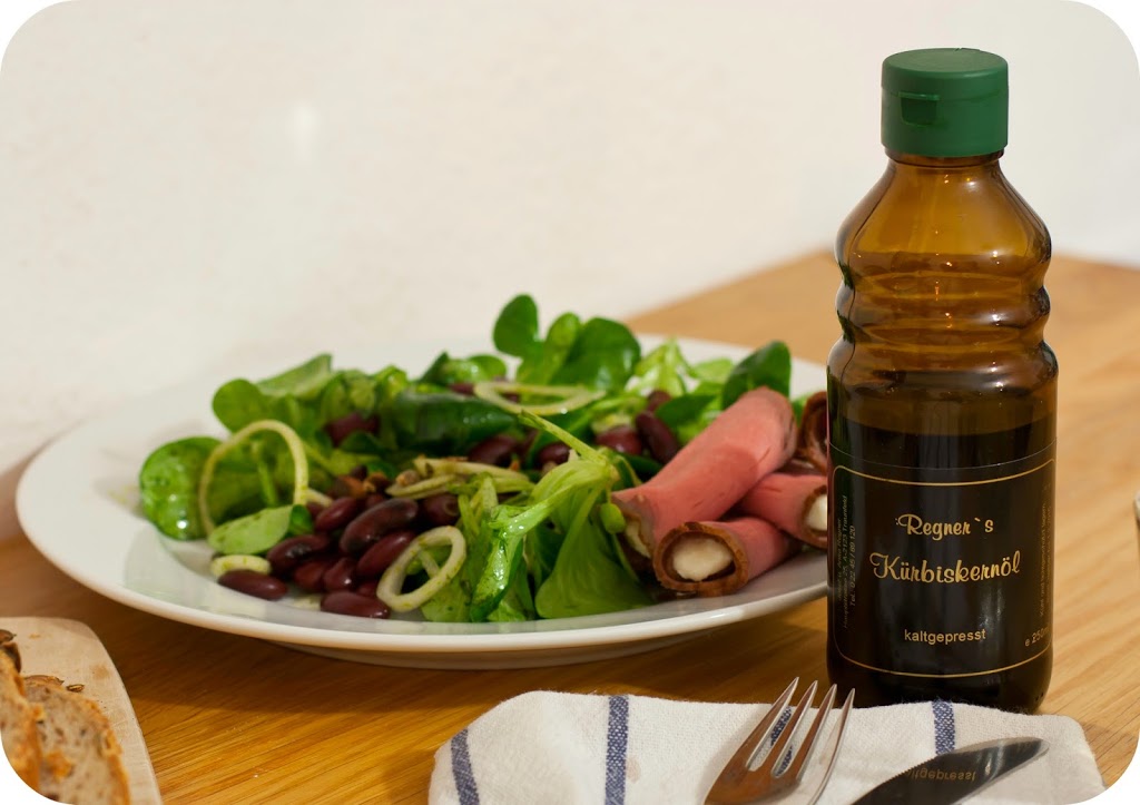 Gestern also, der Sehnsucht nach der heimischen Küche nicht mehr trotzen könnend, musste, um dem Heimweh ein Schnippchen zu schlagen, „wos G’scheits“ auf den Tisch. Ein köstliches Fläschchen Kürbiskernöl der Familie Regner hat es bis nach Niedersachsen geschafft (wird allerdings nicht mehr lange durchhalten 😉 und sollte für einen Steirischen Käferbohnensalat herhalten. Steirische Käferbohnen sind in Niedersachsen denkbar schwer zu bekommen (trotz unfassbarer Auswahl an Bohnen in allen Farben und Größen und Soßen) – rote Bohnen haben einen sehr guten Ersatz geboten.