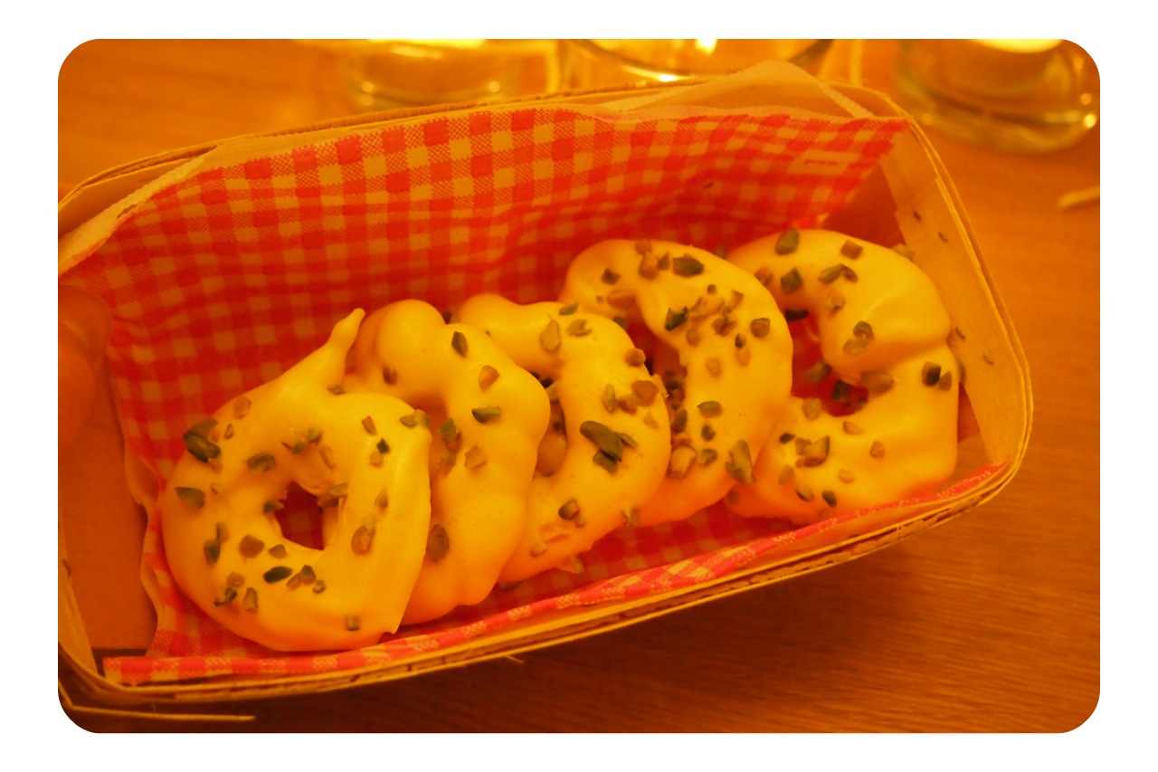 Also wer es dann geschafft hat, das Blech zu füllen, kann sie mit den Pistazien oder auch mit Zuckersträuseln dekorieren und schließlich für 3 Stunden im Backrohr trocknen lassen. Hin und wieder soll man das Rohr aufmachen, damit die Feuchtigkeit entweichen kann.